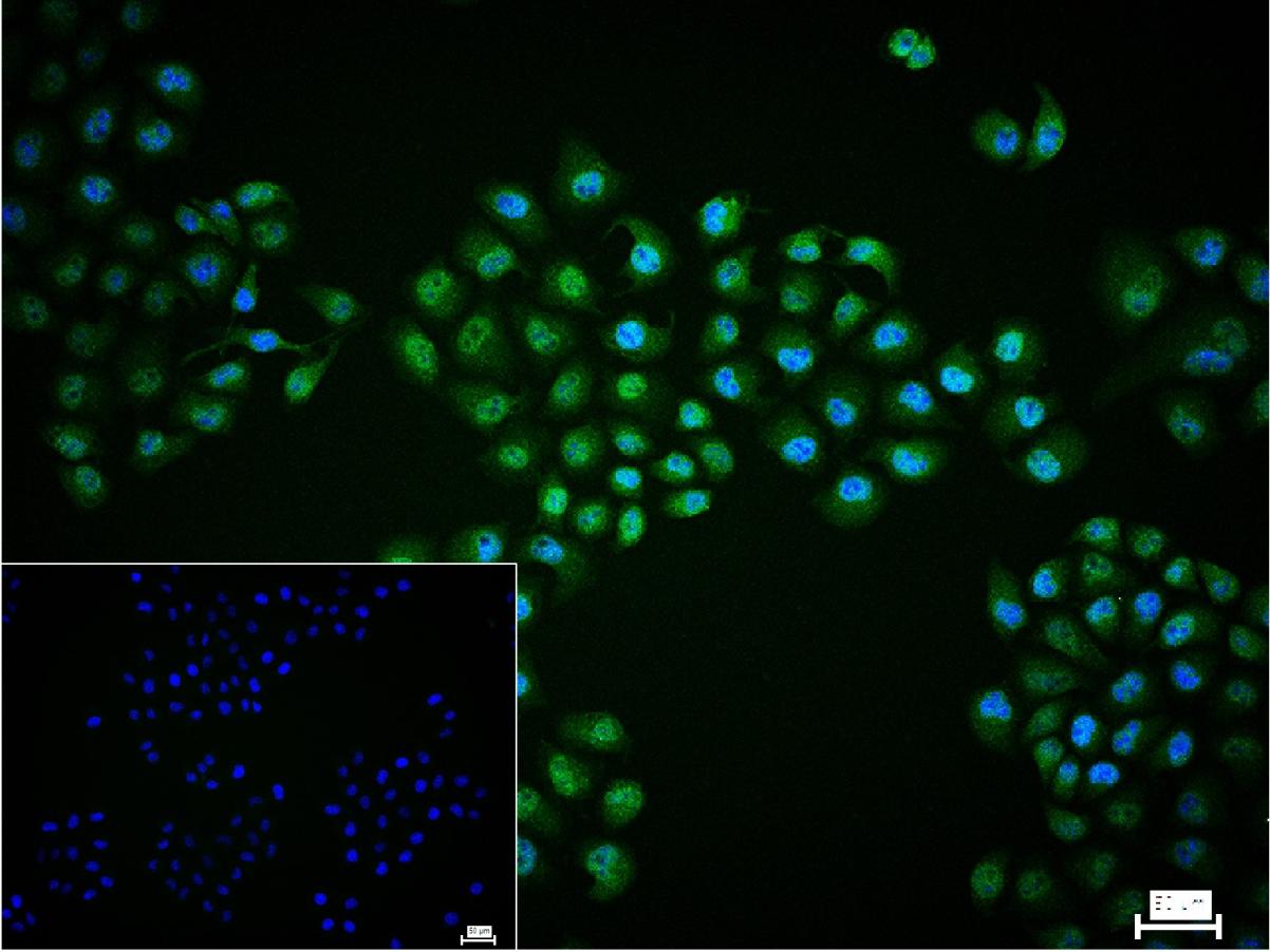 4% Paraformaldehyde-fixed Hela (H) cell; Triton X-100 at r.t. for 20 min; Antibody incubation with (TBL1XR1) monoclonal Antibody, unconjugated (bsm-61975R) 1:100, 90 min at 37°C; followed by conjugated Goat Anti-Rabbit IgG antibody (green, bs-60295G-BF488) at 37°C for 90 min, DAPI (blue, C02-04002) was used to stain the cell nuclei. PBS instead of the primary antibody was used as the blank control.