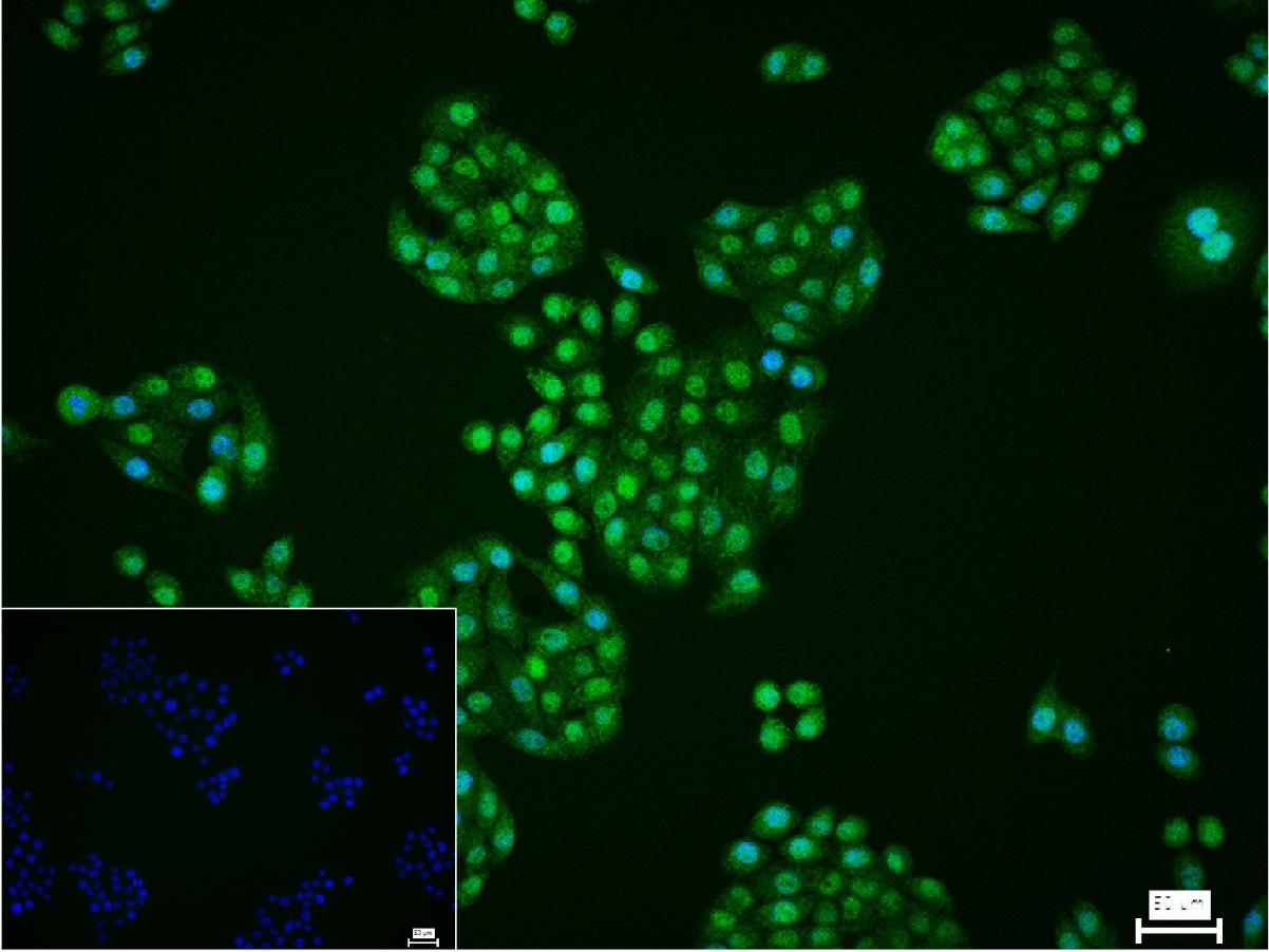 4% Paraformaldehyde-fixed MCF-7 (H) cell; Triton X-100 at r.t. for 20 min; Antibody incubation with (HIPK2) monoclonal Antibody, unconjugated (bsm-62009R) 1:100, 90 min at 37°C; followed by conjugated Goat Anti-Rabbit IgG antibody (green, bs-40295G-FITC) at 37°C for 90 min, DAPI (blue, C02-04002) was used to stain the cell nuclei. PBS instead of the primary antibody was used as the blank control.
