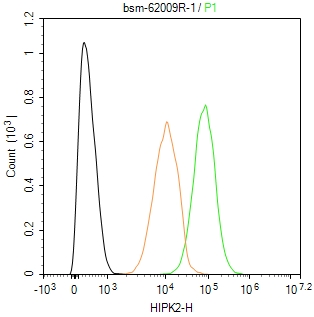 The MCF-7 (H) cells were fixed with 4% PFA (10 min at r.t.) and then permeabilized with 90% ice-cold methanol for 20 min at -20℃,the cells then were incubated in 5%BSA to block non-specific protein-protein interactions (30 min at r.t.), followed by secondary antibody incubation for 40 min at room temperature. Primary Antibody (green):Rabbit Anti-HIPK2 antibody (bsm-62009R,1:100); Isotype Control (orange): Rabbit IgG (bs-0295P). Blank control (black): PBS. Acquisition of 20,000 events was performed.