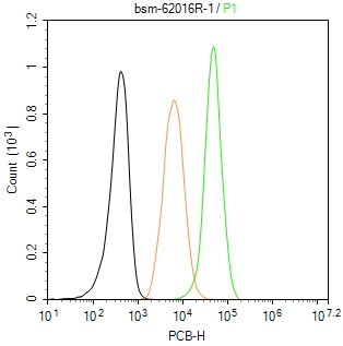 The HepG2 (H) cells were fixed with 4% PFA (10 min at r.t.) and then permeabilized with 90% ice-cold methanol for 20 min at -20℃,the cells then were incubated in 5%BSA to block non-specific protein-protein interactions (30 min at r.t.), followed by secondary antibody incubation for 40 min at room temperature. Primary Antibody (green):Rabbit Anti-PCB antibody (bsm-62016R,1:100); Isotype Control (orange): Rabbit IgG (bs-0295P). Blank control (black): PBS. Acquisition of 20,000 events was performed.