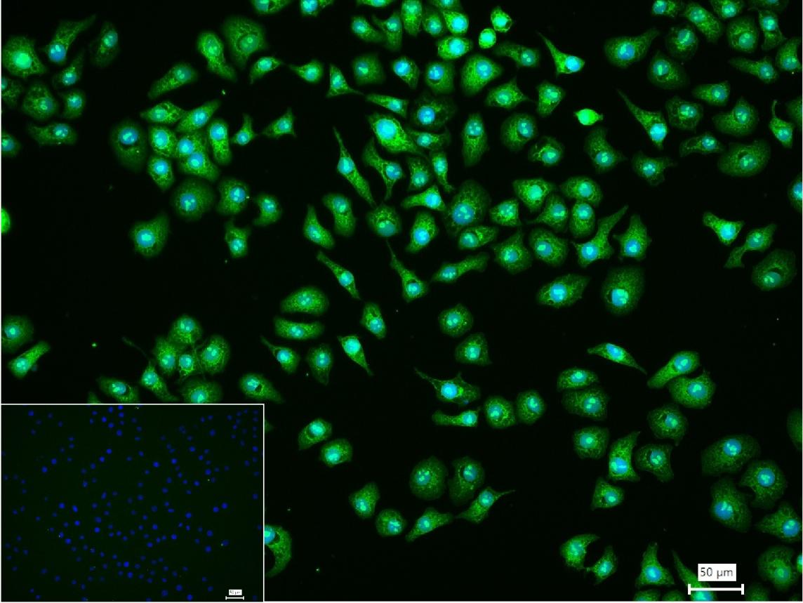 4% Paraformaldehyde-fixed HepG2 (H) cell; Triton X-100 at r.t. for 20 min; Antibody incubation with (PCYT1A) monoclonal Antibody, unconjugated (bsm-62059R) 1:100, 90 min at 37°C; followed by conjugated Goat Anti-Rabbit IgG antibody (green, bs-40295G-FITC) at 37°C for 90 min, DAPI (blue, C02-04002) was used to stain the cell nuclei. PBS instead of the primary antibody was used as the blank control.