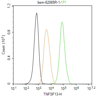 The Hela (H) cells were fixed with 4% PFA (10 min at r.t.) and then permeabilized with 90% ice-cold methanol for 20 min at -20℃,the cells then were incubated in 5%BSA to block non-specific protein-protein interactions (30 min at r.t.), followed by secondary antibody incubation for 40 min at room temperature. Primary Antibody (green):Rabbit Anti-TNFSF13 antibody (bsm-62065R,1:100); Isotype Control (orange): Rabbit IgG (bs-0295P). Blank control (black): PBS. Acquisition of 20,000 events was performed.