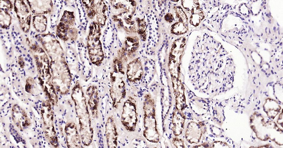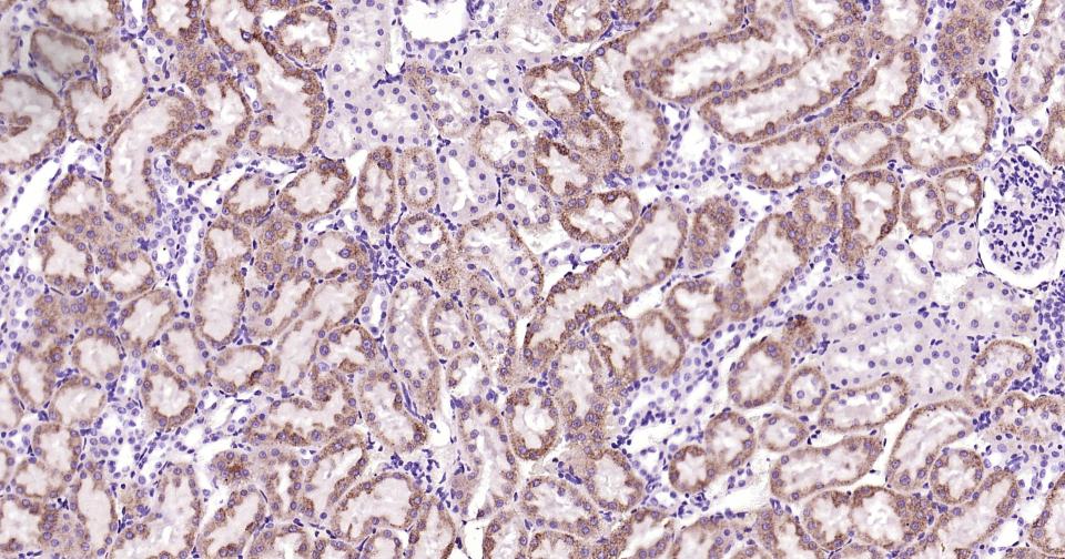 Paraformaldehyde-fixed, paraffin embedded Human Kidney; Antigen retrieval by boiling in sodium citrate buffer (pH6.0) for 15 min; Antibody incubation with ABAT Monoclonal Antibody, Unconjugated(bsm-62069R) at 1:200 overnight at 4°C, followed by conjugation to the bs-0295G-HRP and DAB (C-0010) staining.