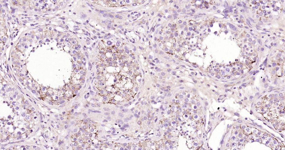Paraformaldehyde-fixed, paraffin embedded Human Testicles; Antigen retrieval by boiling in sodium citrate buffer (pH6.0) for 15 min; Antibody incubation with ABAT Monoclonal Antibody, Unconjugated(bsm-62069R) at 1:200 overnight at 4°C, followed by conjugation to the bs-0295G-HRP and DAB (C-0010) staining.
