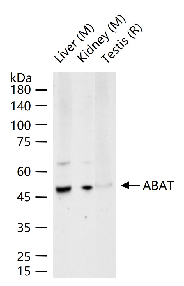 25 ug total protein per lane of various lysates (see on figure) probed with ABAT monoclonal antibody, unconjugated (bsm-62069R) at 1:1000 dilution and 4°C overnight incubation. Followed by conjugated secondary antibody incubation at r.t. for 60 min.