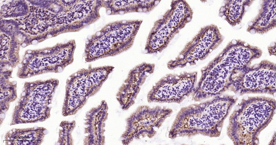 Paraformaldehyde-fixed, paraffin embedded Mouse Small Intestine; Antigen retrieval by boiling in sodium citrate buffer (pH6.0) for 15 min; The section was incubated with PMCA1 Monoclonal Antibody, Unconjugated (bsm-62073R) at 1:200 overnight at 4°C, followed by conjugation to the bs-0295G-HRP and DAB (C-0010) staining.