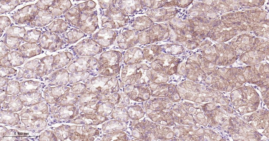 Paraformaldehyde-fixed, paraffin embedded Mouse Stomach; Antigen retrieval by boiling in sodium citrate buffer (pH6.0) for 15 min; The section was incubated with PMCA1 Monoclonal Antibody, Unconjugated (bsm-62073R) at 1:200 overnight at 4°C, followed by conjugation to the bs-0295G-HRP and DAB (C-0010) staining.