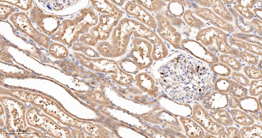 Paraformaldehyde-fixed, paraffin embedded Rat Kidney; Antigen retrieval by boiling in sodium citrate buffer (pH6.0) for 15 min; The section was incubated with TCP1 beta Monoclonal Antibody, Unconjugated (bsm-62080R) at 1:200 overnight at 4°C, followed by conjugation to the bs-0295G-HRP and DAB (C-0010) staining.