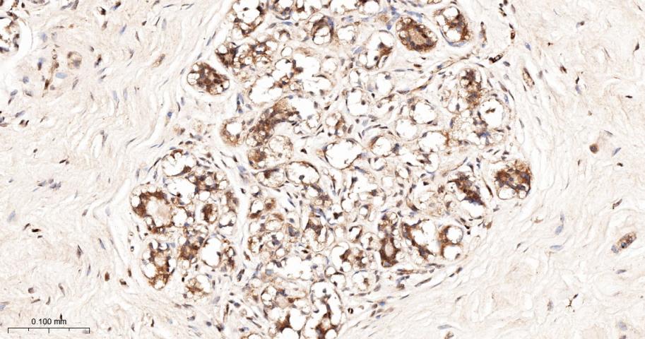Paraformaldehyde-fixed, paraffin embedded Human Breast Cancer; Antigen retrieval by boiling in sodium citrate buffer (pH6.0) for 15 min; The section was incubated with TCP1 beta Monoclonal Antibody, Unconjugated (bsm-62080R) at 1:200 overnight at 4°C, followed by conjugation to the bs-0295G-HRP and DAB (C-0010) staining.
