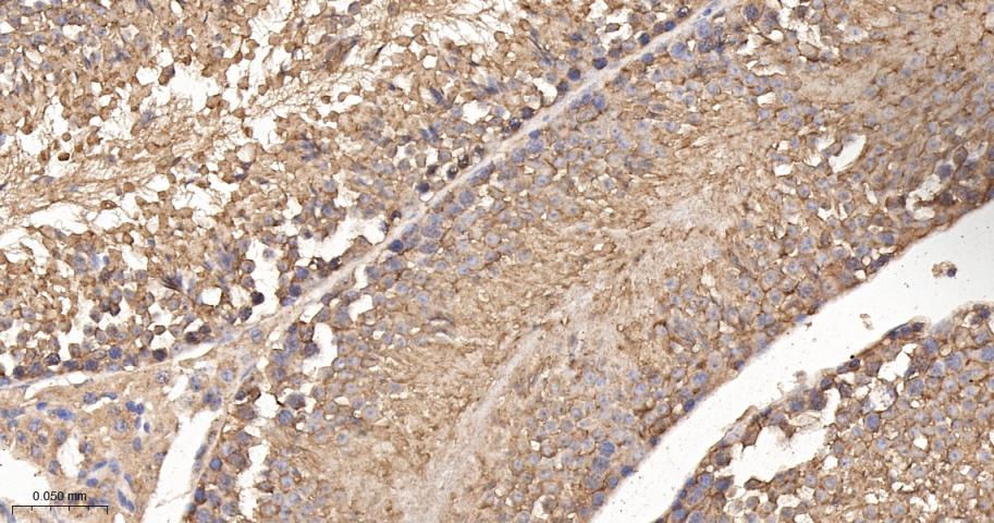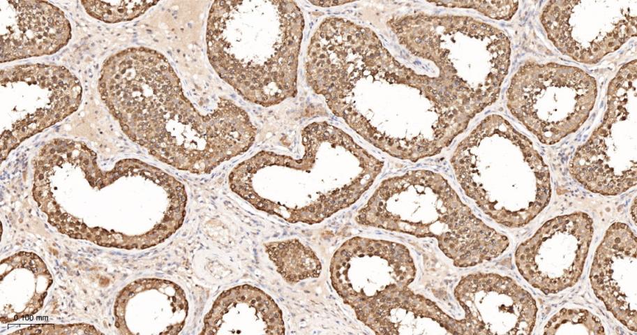 Paraformaldehyde-fixed, paraffin embedded Rat Testicles; Antigen retrieval by boiling in sodium citrate buffer (pH6.0) for 15 min; The section was incubated with TCP1 beta Monoclonal Antibody, Unconjugated (bsm-62080R) at 1:200 overnight at 4°C, followed by conjugation to the bs-0295G-HRP and DAB (C-0010) staining.