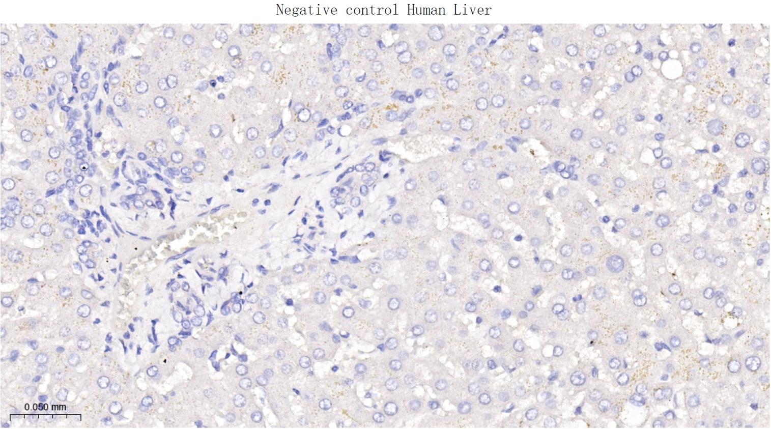 (Negative control) Paraformaldehyde-fixed, paraffin embedded Human Liver; Antigen retrieval by boiling in sodium citrate buffer (pH6.0) for 15 min; The section was incubated with GluR1 Monoclonal Antibody, Unconjugated (bsm-62123R) at 1:200 overnight at 4°C, followed by conjugation to the bs-0295G-HRP and DAB (C-0010) staining.