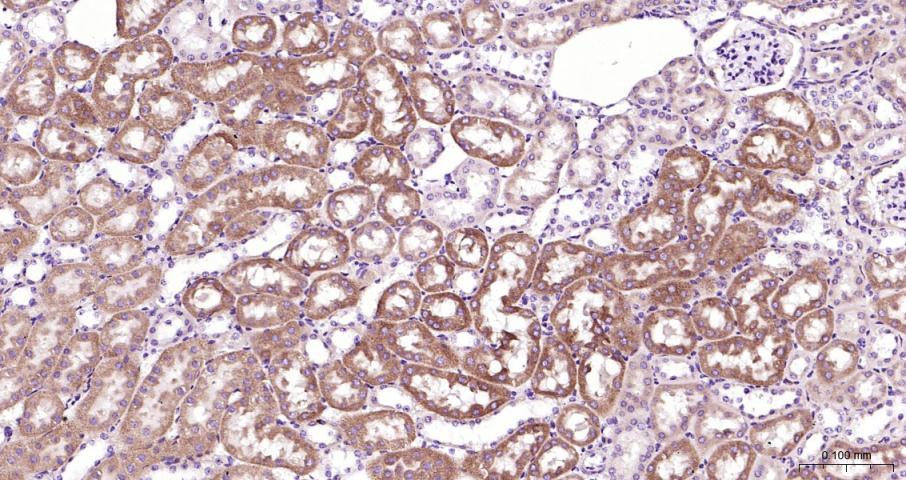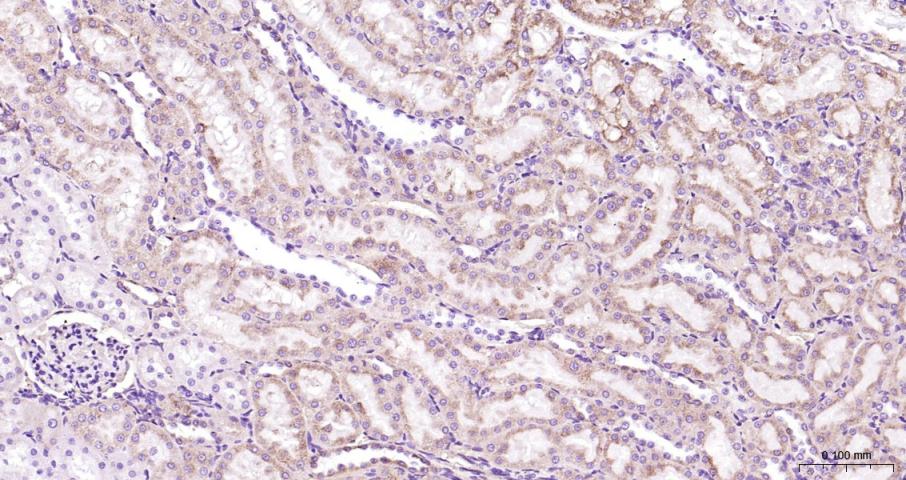 Paraformaldehyde-fixed, paraffin embedded Mouse Kidney; Antigen retrieval by boiling in sodium citrate buffer (pH6.0) for 15 min; Antibody incubation with PAR-2 Monoclonal Antibody, Unconjugated(bsm-62143R) at 1:200 overnight at 4°C, followed by conjugation to the bs-0295G-HRP and DAB (C-0010) staining.
