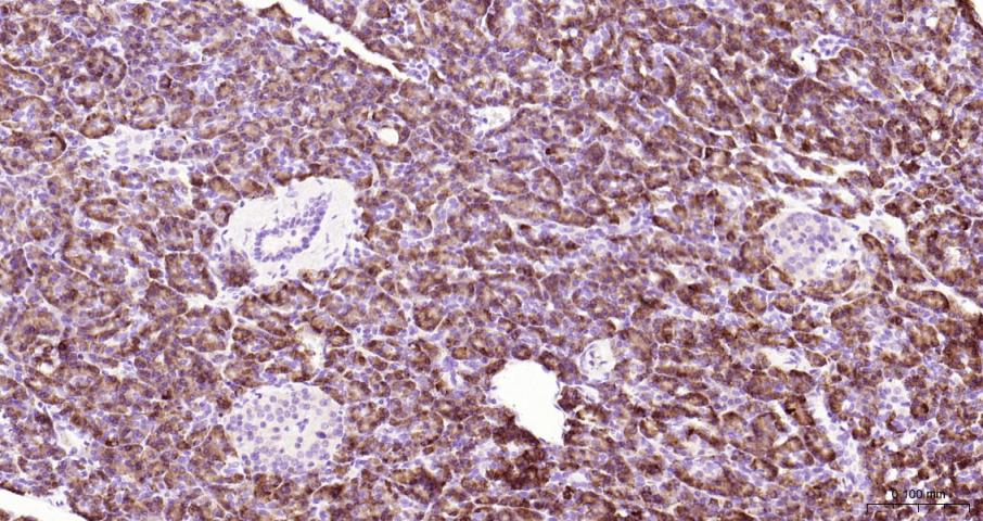Paraformaldehyde-fixed, paraffin embedded Rat Pancreas; Antigen retrieval by boiling in sodium citrate buffer (pH6.0) for 15 min; Antibody incubation with PAR-2 Monoclonal Antibody, Unconjugated(bsm-62143R) at 1:200 overnight at 4°C, followed by conjugation to the bs-0295G-HRP and DAB (C-0010) staining.