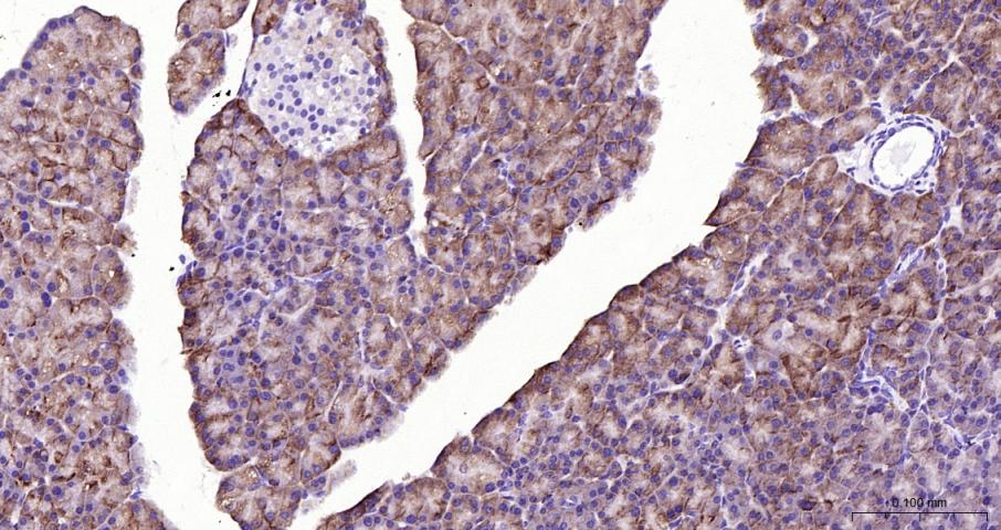 Paraformaldehyde-fixed, paraffin embedded Mouse Pancreas; Antigen retrieval by boiling in sodium citrate buffer (pH6.0) for 15 min; Antibody incubation with PAR-2 Monoclonal Antibody, Unconjugated(bsm-62143R) at 1:200 overnight at 4°C, followed by conjugation to the bs-0295G-HRP and DAB (C-0010) staining.