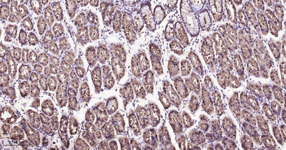 Paraformaldehyde-fixed, paraffin embedded Rat Stomach; Antigen retrieval by boiling in sodium citrate buffer (pH6.0) for 15 min; Antibody incubation with IDH1 Monoclonal Antibody, Unconjugated(bsm-62156R) at 1:200 overnight at 4°C, followed by conjugation to the bs-0295G-HRP and DAB (C-0010) staining.