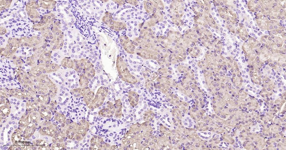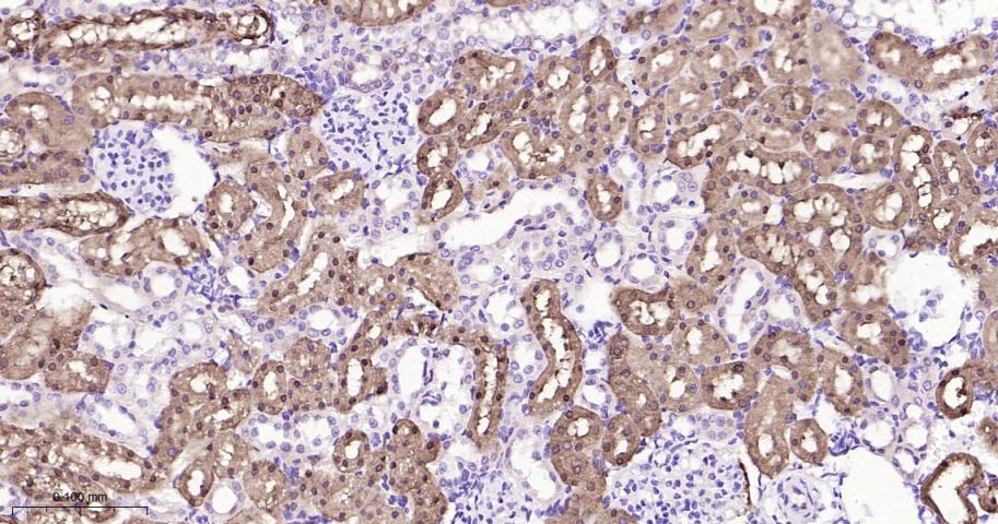 Paraformaldehyde-fixed, paraffin embedded Rat Kidney; Antigen retrieval by boiling in sodium citrate buffer (pH6.0) for 15 min; Antibody incubation with IDH1 Monoclonal Antibody, Unconjugated(bsm-62156R) at 1:200 overnight at 4°C, followed by conjugation to the bs-0295G-HRP and DAB (C-0010) staining.