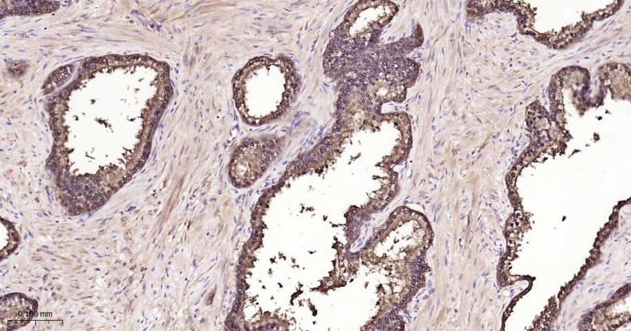 Paraformaldehyde-fixed, paraffin embedded Human Prostate Cancer; Antigen retrieval by boiling in sodium citrate buffer (pH6.0) for 15 min; Antibody incubation with IDH1 Monoclonal Antibody, Unconjugated(bsm-62156R) at 1:200 overnight at 4°C, followed by conjugation to the bs-0295G-HRP and DAB (C-0010) staining.
