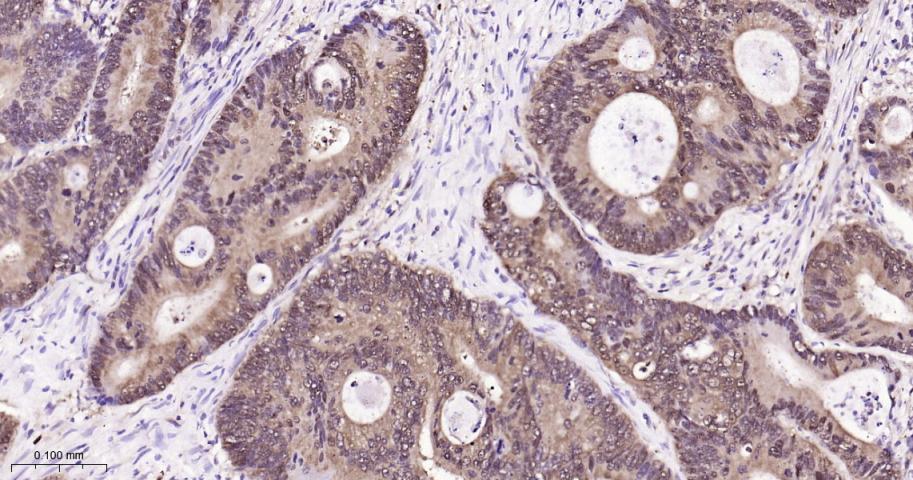 Paraformaldehyde-fixed, paraffin embedded Human Colon Cancer; Antigen retrieval by boiling in sodium citrate buffer (pH6.0) for 15 min; Antibody incubation with IDH1 Monoclonal Antibody, Unconjugated(bsm-62156R) at 1:200 overnight at 4°C, followed by conjugation to the bs-0295G-HRP and DAB (C-0010) staining.