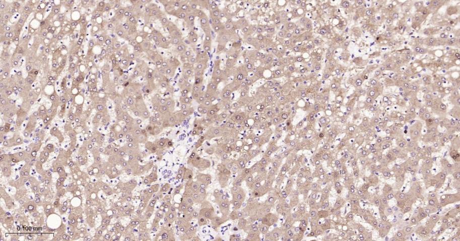 Paraformaldehyde-fixed, paraffin embedded Rat Liver; Antigen retrieval by boiling in sodium citrate buffer (pH6.0) for 15 min; Antibody incubation with IDH1 Monoclonal Antibody, Unconjugated(bsm-62156R) at 1:200 overnight at 4°C, followed by conjugation to the bs-0295G-HRP and DAB (C-0010) staining.