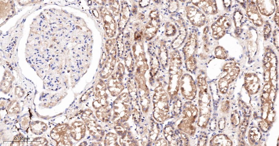 Paraformaldehyde-fixed, paraffin embedded Human kidney; Antigen retrieval by boiling in sodium citrate buffer (pH6.0) for 15 min; Antibody incubation with LGR6 Monoclonal Antibody, Unconjugated(bsm-62179R) at 1:200 overnight at 4°C, followed by conjugation to the bs-0295G-HRP and DAB (C-0010) staining.