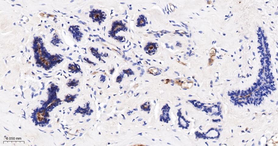 Paraformaldehyde-fixed, paraffin embedded Human Breast; Antigen retrieval by boiling in sodium citrate buffer (pH6.0) for 15 min; The section was incubated with LGR6 Monoclonal Antibody, Unconjugated (bsm-62179R) at 1:200 overnight at 4°C, followed by conjugation to the bs-0295G-HRP and DAB (C-0010) staining.