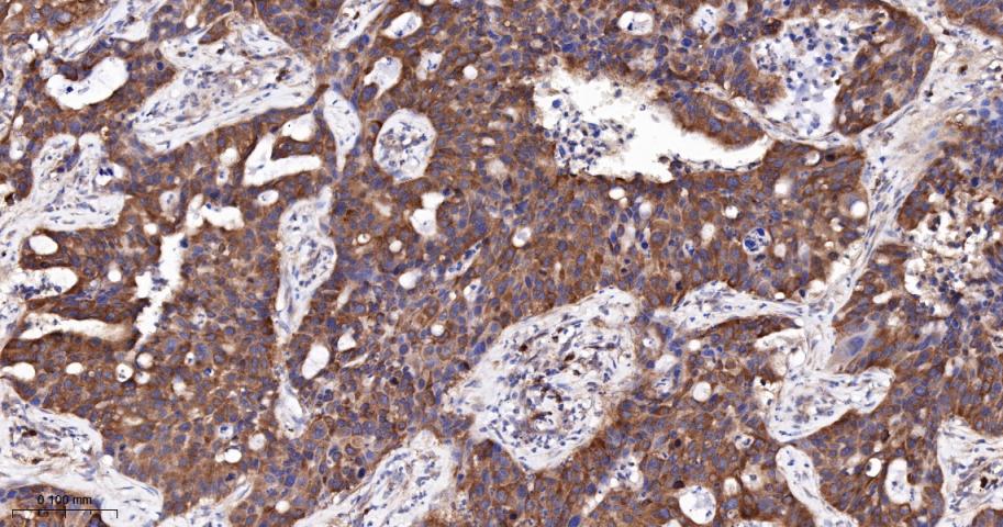 Paraformaldehyde-fixed, paraffin embedded Human Lung Cancer; Antigen retrieval by boiling in sodium citrate buffer (pH6.0) for 15 min; The section was incubated with LGR6 Monoclonal Antibody, Unconjugated (bsm-62179R) at 1:200 overnight at 4°C, followed by conjugation to the bs-0295G-HRP and DAB (C-0010) staining.