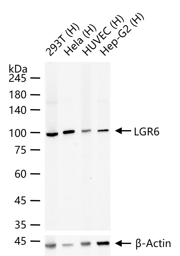 25 ug total protein per lane of various lysates (see on figure) probed with LGR6 monoclonal antibody, unconjugated (bsm-62179R) at 1:1000 dilution and 4°C overnight incubation. Followed by conjugated secondary antibody incubation at r.t. for 60 min.