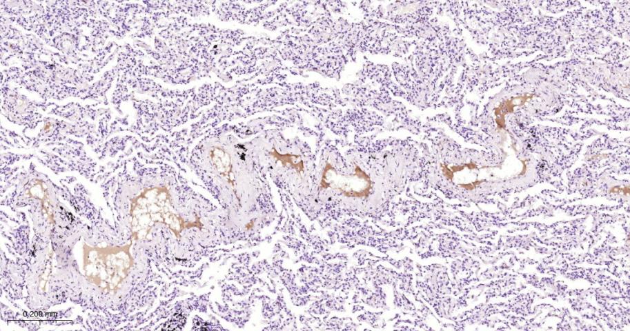 Paraformaldehyde-fixed, paraffin embedded Human Lung; Antigen retrieval by boiling in sodium citrate buffer (pH6.0) for 15 min; Antibody incubation with Fibrinogen alpha chain Monoclonal Antibody, Unconjugated(bsm-62182R) at 1:100 overnight at 4°C, followed by conjugation to the bs-0295G-HRP and DAB (C-0010) staining.