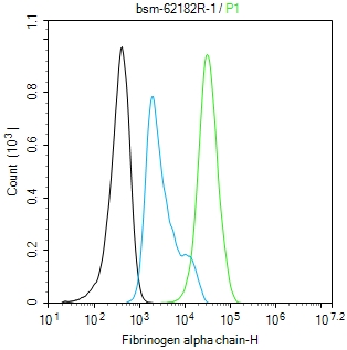 The HepG2 (H) cells were fixed with 4% PFA (10 min at r.t.) and then permeabilized with 90% ice-cold methanol for 20 min at -20℃,the cells then were incubated in 5%BSA to block non-specific protein-protein interactions (30 min at r.t.).Primary Antibody (green):Rabbit Anti-Fibrinogen alpha chain antibody (bsm-62182R,1:100); Secondary Antibody (white blue): Goat anti-Rabbit IgG-BF488 (bs-60295G-BF488): 1 μg/test. Blank control (black): PBS. Acquisition of 20,000 events was performed.