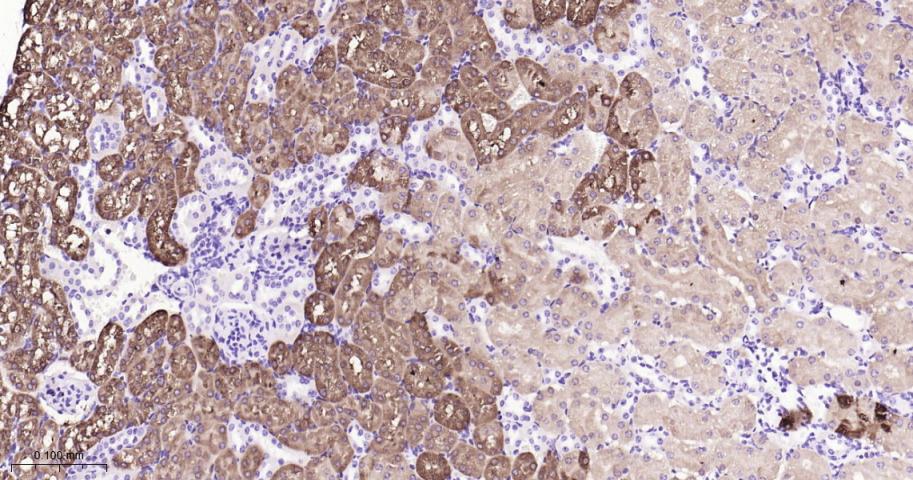 Paraformaldehyde-fixed, paraffin embedded Mouse Kidney; Antigen retrieval by boiling in sodium citrate buffer (pH6.0) for 15 min; Antibody incubation with Argininosuccinate synthase 1 Monoclonal Antibody, Unconjugated(bsm-62194R) at 1:200 overnight at 4°C, followed by conjugation to the bs-0295G-HRP and DAB (C-0010) staining.