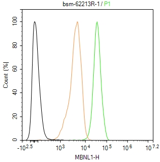 The Jurkat (H) cells were fixed with 4% PFA (10 min at r.t.) and then permeabilized with 90% ice-cold methanol for 20 min at -20℃,the cells then were incubated in 5%BSA to block non-specific protein-protein interactions (30 min at r.t.), followed by secondary antibody incubation for 40 min at room temperature. Primary Antibody (green):Rabbit Anti-MBNL1 antibody (bsm-62213R,1;100); Isotype Control (orange): Rabbit IgG (bs-0295P). Blank control (black): PBS. Acquisition of 20,000 events was performed.