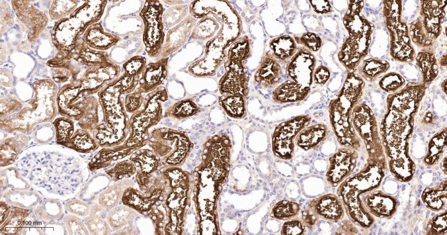 Paraformaldehyde-fixed, paraffin embedded Human Kidney; Antigen retrieval by boiling in sodium citrate buffer (pH6.0) for 15 min; The section was incubated with GGT1 Monoclonal Antibody, Unconjugated (bsm-62227R) at 1:200 overnight at 4°C, followed by conjugation to the bs-0295G-HRP and DAB (C-0010) staining.
