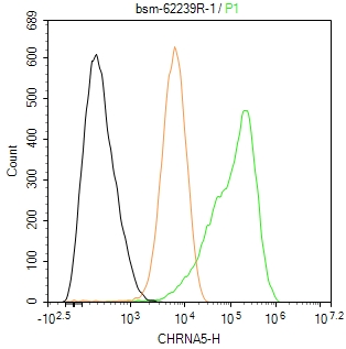 The MCF-7 (H) cells were incubated in 5%BSA to block non-specific protein-protein interactions (30 min at r.t.) , followed by secondary antibody incubation for 40 min at room temperature. Primary Antibody (green): Rabbit Anti-CHRNA5 antibody (bsm-62239R,1:100); Isotype Control (orange): Rabbit IgG (bs-0295P). Blank control (black): PBS. Acquisition of 20,000 events was performed.