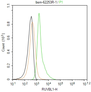 The HT-1080 (H) cells were fixed with 4% PFA (10 min at r.t.) and then permeabilized with 90% ice-cold methanol for 20 min at -20℃,the cells then were incubated in 5%BSA to block non-specific protein-protein interactions (30 min at r.t.), followed by secondary antibody incubation for 40 min at room temperature. Primary Antibody (green):Rabbit Anti-RUVBL1 antibody (bsm-62253R,1:100); Isotype Control (orange): Rabbit IgG (bs-0295P). Blank control (black): PBS. Acquisition of 20,000 events was performed.