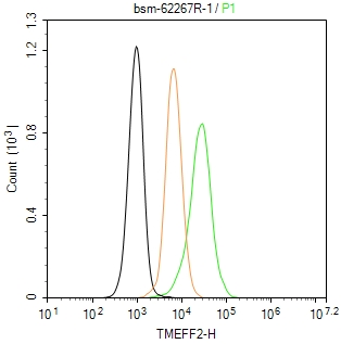 The SH-SY5Y (H) cells were incubated in 5%BSA to block non-specific protein-protein interactions (30 min at r.t.) , followed by secondary antibody incubation for 40 min at room temperature. Primary Antibody (green): Rabbit Anti-TMEFF2 antibody (bsm-62267R,1:100); Isotype Control (orange): Rabbit IgG (bs-0295P). Secondary Antibody (white blue): Goat anti-Rabbit IgG-BF488 (bs-60295G-BF488): 1 μg/test.Blank control (black): PBS. Acquisition of 20,000 events was performed.