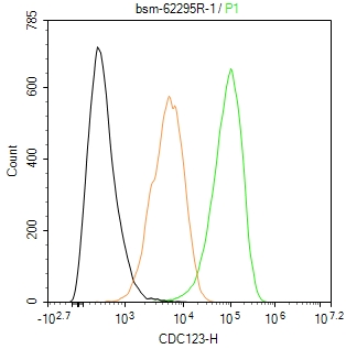 The 293T (H) cells were fixed with 4% PFA (10 min at r.t.) and then permeabilized with 90% ice-cold methanol for 20 min at -20℃,the cells then were incubated in 5%BSA to block non-specific protein-protein interactions (30 min at r.t.), followed by secondary antibody incubation for 40 min at room temperature. Primary Antibody (green):Rabbit Anti-CDC123 antibody (bsm-62295R,1:100); Isotype Control (orange): Rabbit IgG (bs-0295P). Blank control (black): PBS. Acquisition of 20,000 events was performed.