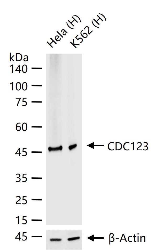 Western blot analysis of HeLa cell lysate. Using CDC123 (bsm-62295R) monoclonal antibody at 1:1000 dilution and 4°C overnight incubation. Followed by conjugated secondary antibody incubation at r.t. for 60 min.