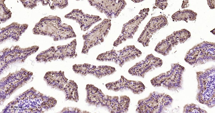 Paraformaldehyde-fixed, paraffin embedded Rat Small Intestine; Antigen retrieval by boiling in sodium citrate buffer (pH6.0) for 15 min; The section was incubated with IFABP Monoclonal Antibody, Unconjugated (bsm-62307R) at 1:200 overnight at 4°C, followed by conjugation to the bs-0295G-HRP and DAB (C-0010) staining.