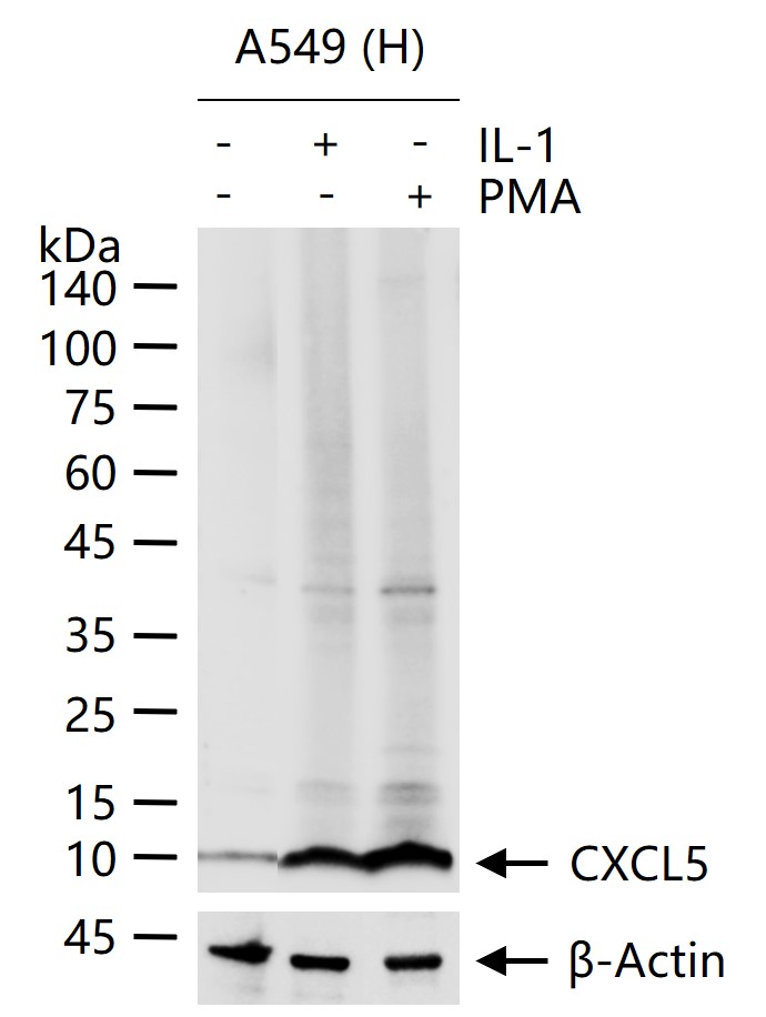 A549 (H) cells were treated with or without IL-1 for 24 h, PMA (200 nM) for 24 h, 25 μg total protein per lane of cell lysates (see on figure) probed with CXCL5 monoclonal antibody, unconjugated (bsm-62331R) at 1:1000 dilution and 4°C overnight incubation. Followed by conjugated secondary antibody incubation at r.t. for 60 min.