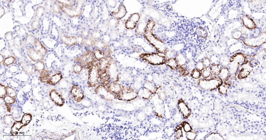 Paraformaldehyde-fixed, paraffin embedded Mouse Kidney; Antigen retrieval by boiling in sodium citrate buffer (pH6.0) for 15 min; The section was incubated with HMGCS2 Monoclonal Antibody, Unconjugated (bsm-62355R) at 1:200 overnight at 4°C, followed by conjugation to the bs-0295G-HRP and DAB (C-0010) staining.