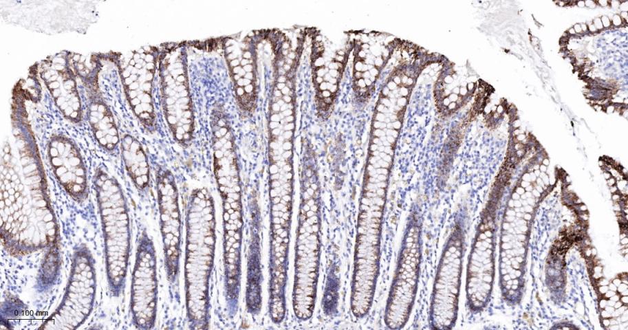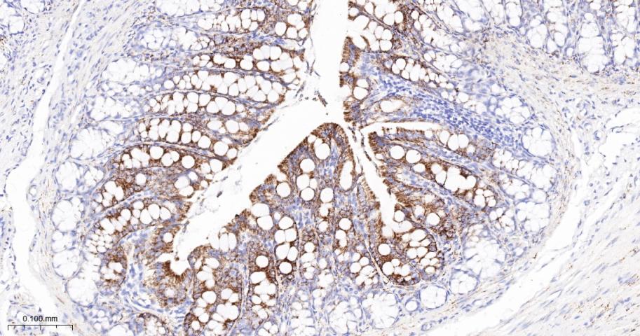 Paraformaldehyde-fixed, paraffin embedded Mouse Colon; Antigen retrieval by boiling in sodium citrate buffer (pH6.0) for 15 min; The section was incubated with HMGCS2 Monoclonal Antibody, Unconjugated (bsm-62355R) at 1:200 overnight at 4°C, followed by conjugation to the bs-0295G-HRP and DAB (C-0010) staining.