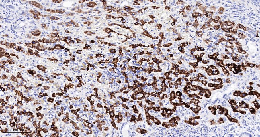 Paraformaldehyde-fixed, paraffin embedded Human Liver; Antigen retrieval by boiling in sodium citrate buffer (pH6.0) for 15 min; The section was incubated with HMGCS2 Monoclonal Antibody, Unconjugated (bsm-62355R) at 1:200 overnight at 4°C, followed by conjugation to the bs-0295G-HRP and DAB (C-0010) staining.