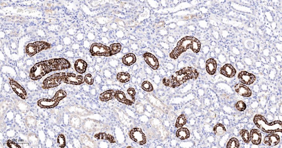 Paraformaldehyde-fixed, paraffin embedded Rat Kidney; Antigen retrieval by boiling in sodium citrate buffer (pH6.0) for 15 min; The section was incubated with HMGCS2 Monoclonal Antibody, Unconjugated (bsm-62355R) at 1:200 overnight at 4°C, followed by conjugation to the bs-0295G-HRP and DAB (C-0010) staining.