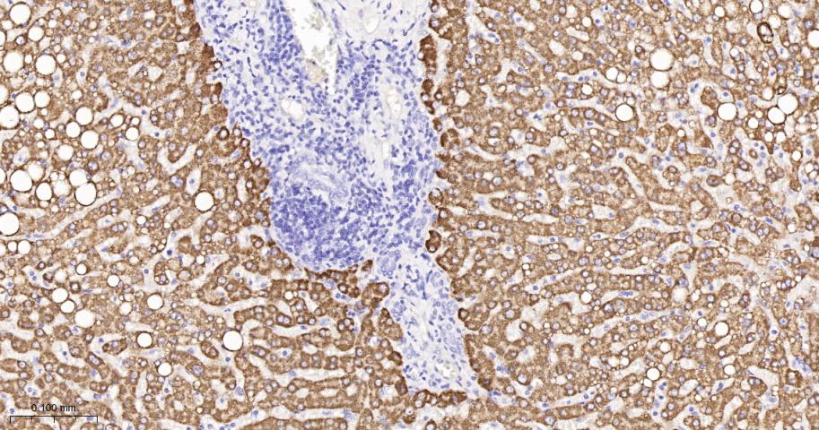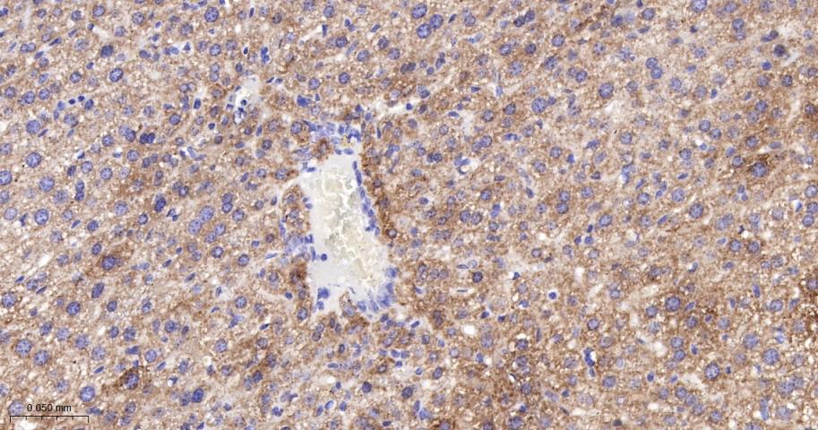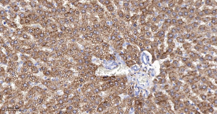 Paraformaldehyde-fixed, paraffin embedded Rat Liver; Antigen retrieval by boiling in sodium citrate buffer (pH6.0) for 15 min; The section was incubated with HMGCS2 Monoclonal Antibody, Unconjugated (bsm-62355R) at 1:200 overnight at 4°C, followed by conjugation to the bs-0295G-HRP and DAB (C-0010) staining.