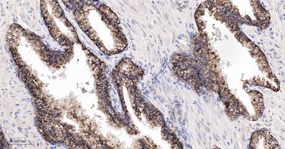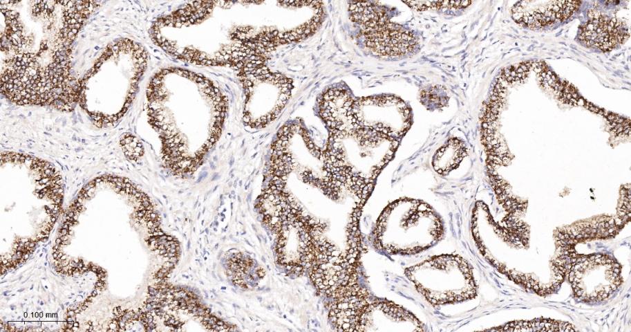 Paraformaldehyde-fixed, paraffin embedded Human Prostate; Antigen retrieval by boiling in sodium citrate buffer (pH6.0) for 15 min; The section was incubated with Arginase2 Monoclonal Antibody, Unconjugated (bsm-62356R) at 1:200 overnight at 4°C, followed by conjugation to the bs-0295G-HRP and DAB (C-0010) staining.