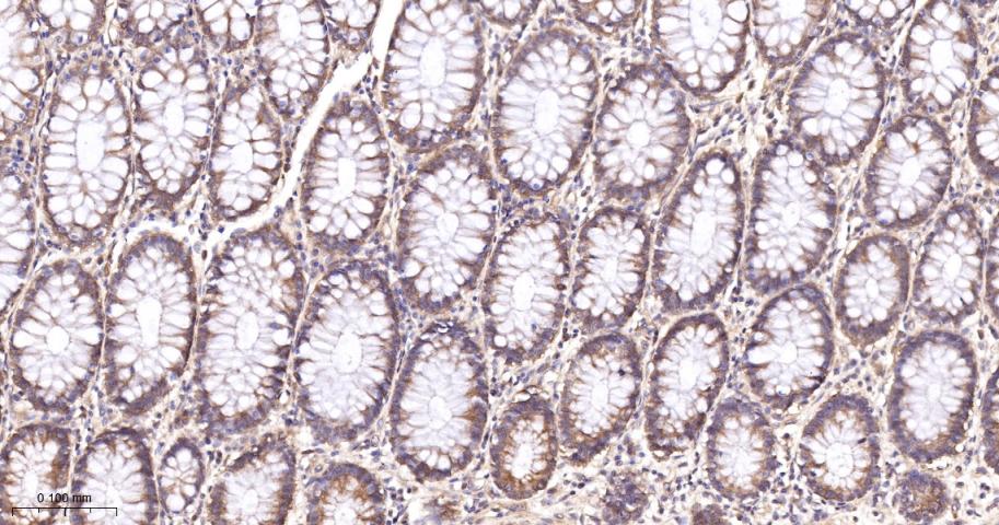 Paraformaldehyde-fixed, paraffin embedded Human Colon; Antigen retrieval by boiling in sodium citrate buffer (pH6.0) for 15 min; The section was incubated with Arginase2 Monoclonal Antibody, Unconjugated (bsm-62356R) at 1:200 overnight at 4°C, followed by conjugation to the bs-0295G-HRP and DAB (C-0010) staining.