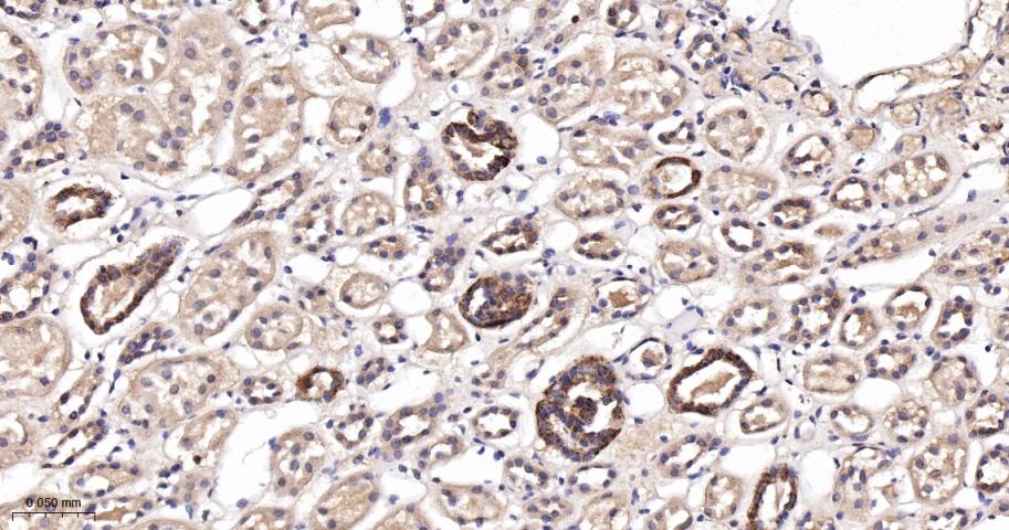 Paraformaldehyde-fixed, paraffin embedded Human Kidney; Antigen retrieval by boiling in sodium citrate buffer (pH6.0) for 15 min; The section was incubated with Arginase2 Monoclonal Antibody, Unconjugated (bsm-62356R) at 1:200 overnight at 4°C, followed by conjugation to the bs-0295G-HRP and DAB (C-0010) staining.
