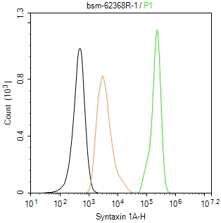 The SH-SY5Y (H) cells were fixed with 4% PFA (10 min at r.t.) and then permeabilized with 90% ice-cold methanol for 20 min at -20℃,the cells then were incubated in 5%BSA to block non-specific protein-protein interactions (30 min at r.t.), followed by secondary antibody incubation for 40 min at room temperature. Primary Antibody (green):Rabbit Anti-Syntaxin 1A antibody (bsm-62368R,1:100); Isotype Control (orange): Rabbit IgG (bs-0295P). Blank control (black): PBS. Acquisition of 20,000 events was performed.