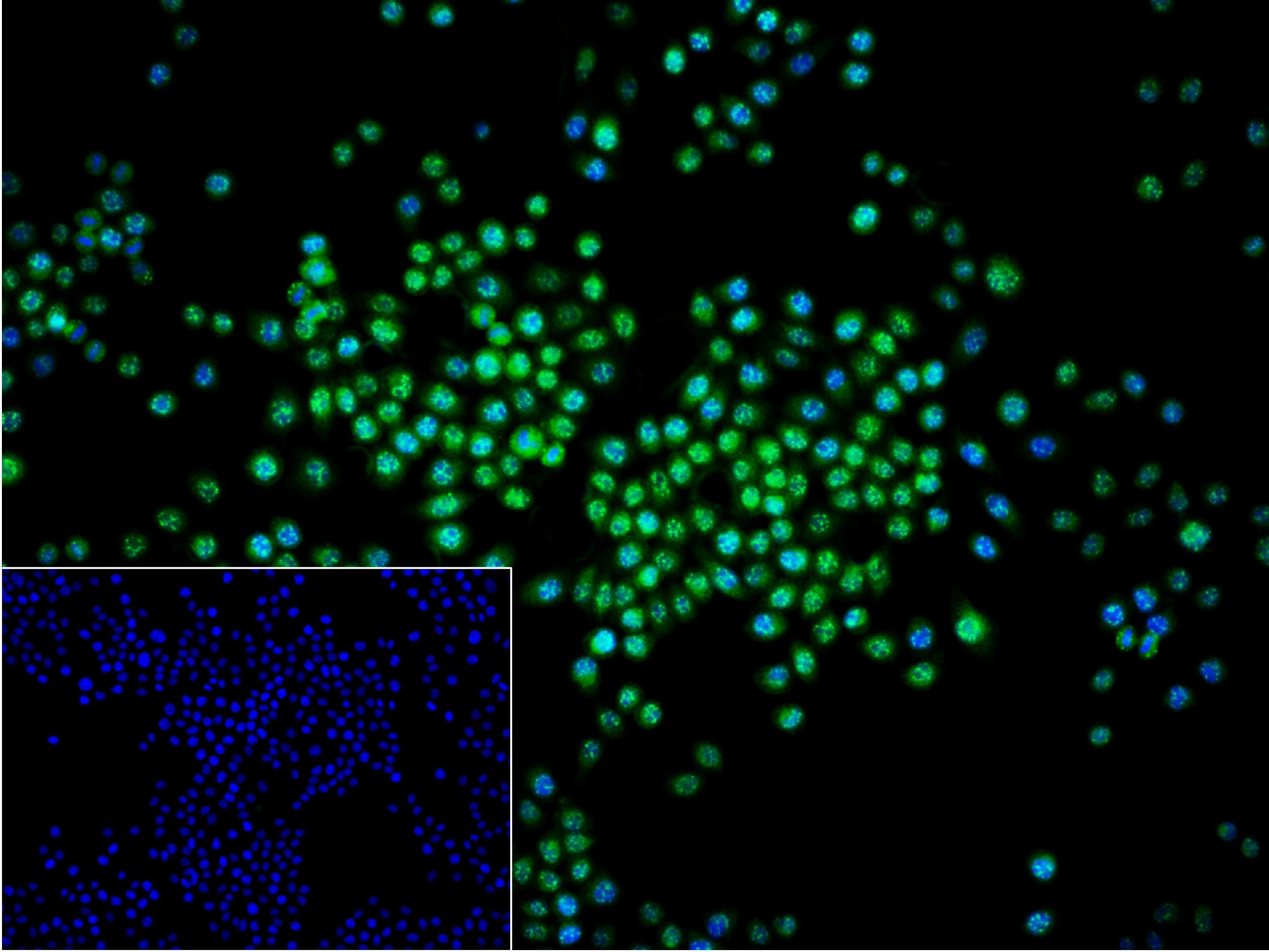 4% Paraformaldehyde-fixed Hela (H) cell; Triton X-100 at r.t. for 20 min; Antibody incubation with (RanBP3) monoclonal Antibody, unconjugated (bsm-62438R) 1:100, 90 min at 37°C; followed by conjugated Goat Anti-Rabbit IgG antibody (green, bs-60295G-BF488) at 37°C for 90 min, DAPI (blue, C02-04002) was used to stain the cell nuclei. PBS instead of the primary antibody was used as the blank control.