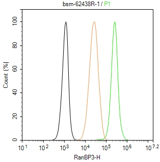 The Hela (H) cells were fixed with 4% PFA (10 min at r.t.) and then permeabilized with 90% ice-cold methanol for 20 min at -20℃,the cells then were incubated in 5%BSA to block non-specific protein-protein interactions (30 min at r.t.), followed by secondary antibody incubation for 40 min at room temperature. Primary Antibody (green):Rabbit Anti-RanBP3 antibody (bsm-62438R,1:100); Isotype Control (orange): Rabbit IgG (bs-0295P). Blank control (black): PBS. Acquisition of 20,000 events was performed.
